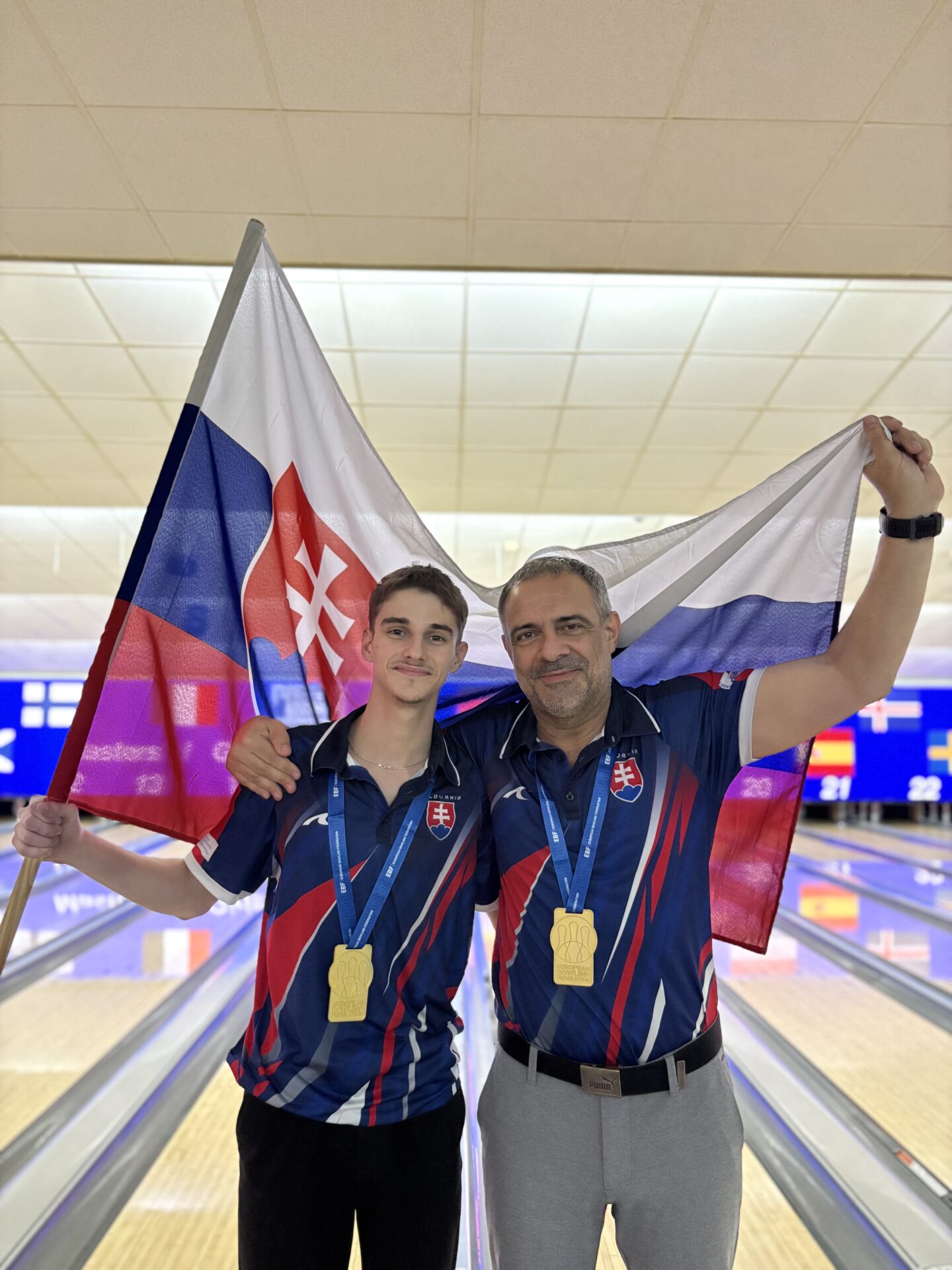 Naša juniorská dvojica Filip a Filip dnes ráno nastúpili v tretej runde a odohrali súťaž dvojíc. Chlapci odohrali súčet 2089 (174 priemer) a obsadili celkové 53. miesto. V poobednej runde nastúpila naša vyhraná dvojica Matúš a Lukas, ktorí sa dnes bohužiaľ trápili a ukončili súťaž so súčtom 2528 (210 priemer). Dokonca ani taký “vysoký“ priemer na tomto šampionáte neznamená vyššie ako 20. miesto, a to poukazuje na vysokú úroveň šampionátu. Zlatú medailu si v kategórii chlapcov zaslúžene odnášajú Oskar Emil Porskrog a Tobias Kastfelt Bryde z Dánska, ktorí v kvalifikácii dokonca prekonali 3 európske rekordy. Vylepšili súčet dvojice na 1 hru (558 bodov – 279 priemer), na 3 hry (1486 bodov – 247 priemer) a na 6 hier (2936 bodov – 244 priemer). Rovnako treba vyzdvihnúť výkon našich krajanov Andriiho Gadiatskeho a Viktora Miroshnychenka z Ukrajiny, ktorí si vybojovali striebornú medailu. V kategórii dievčat si zlato vybojovali Elin Bergqvist a Lova Nilsson zo Švédska. Rovnako treba vyzdvihnúť výkon Emy Iwazawy a Julie Rácovej z Česka, ktoré si odnášajú bronz. Zajtra našich reprezentantov čaká súťaž tímov, ktorá je oproti súťaži jednotlivcov a dvojíc rozdelená na 2 bloky po 3 hrách. Hneď ráno o 9.00 hod nastúpia chlapci, a poobede o 13.15 naše dievčatá v zmiešanom tíme so Slovinskom. Keďže máme iba 2 dievčatá, baby si odohrajú svoje hry nesúťažne, hry sa im ale budú počítať do celkového hodnotenia All Event.